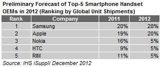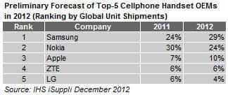 “The competitive reality of the cellphone market in 2012 was ‘live by the smartphone; die by the smartphone,’” said Wayne Lam, senior analyst for wireless communications at IHS. “Smartphones represent the fastest-growing segment of the cellphone market—and will account for nearly half of all wireless handset shipments for all of 2012. Samsung’s successes and Nokia’s struggles in the cellphone market this year were determined entirely by the two companies’ divergent fortunes in the smartphone sector.”